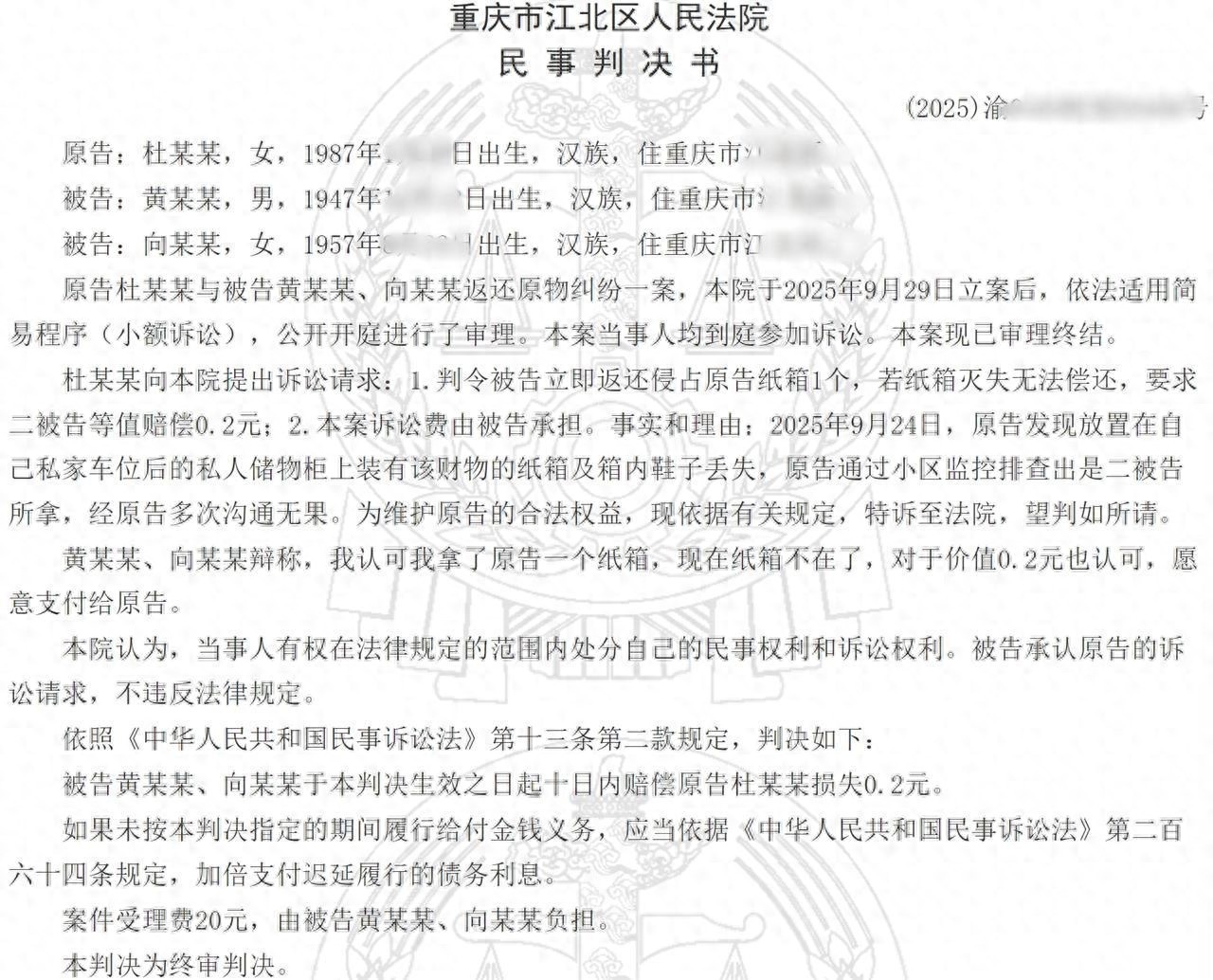 因一个价值仅两毛钱的纸箱,重庆市两位分手年届六十九岁与七十九岁的老东谈主,被又名三十多岁的女子诉诸法律。记者属意到,近日中国裁判告示网公布了这起具有典型预见的案例,且该案件已审理结束。重庆市江北区东谈主民法院的民事判决书载明,2025年9月24日,杜某某发觉摈弃于我方私家车位后方私东谈主储物柜上的纸箱以及箱内的鞋子不翼而飞。杜某某借助小区监控进行排查,详情是黄某某、向某某拿走了物品。而后,杜某某屡次与之疏导,却未能达成处分问题的共鸣。为选藏自己正当权益,杜某某依据谋划律例开yun体育网,向法院拿告状讼。