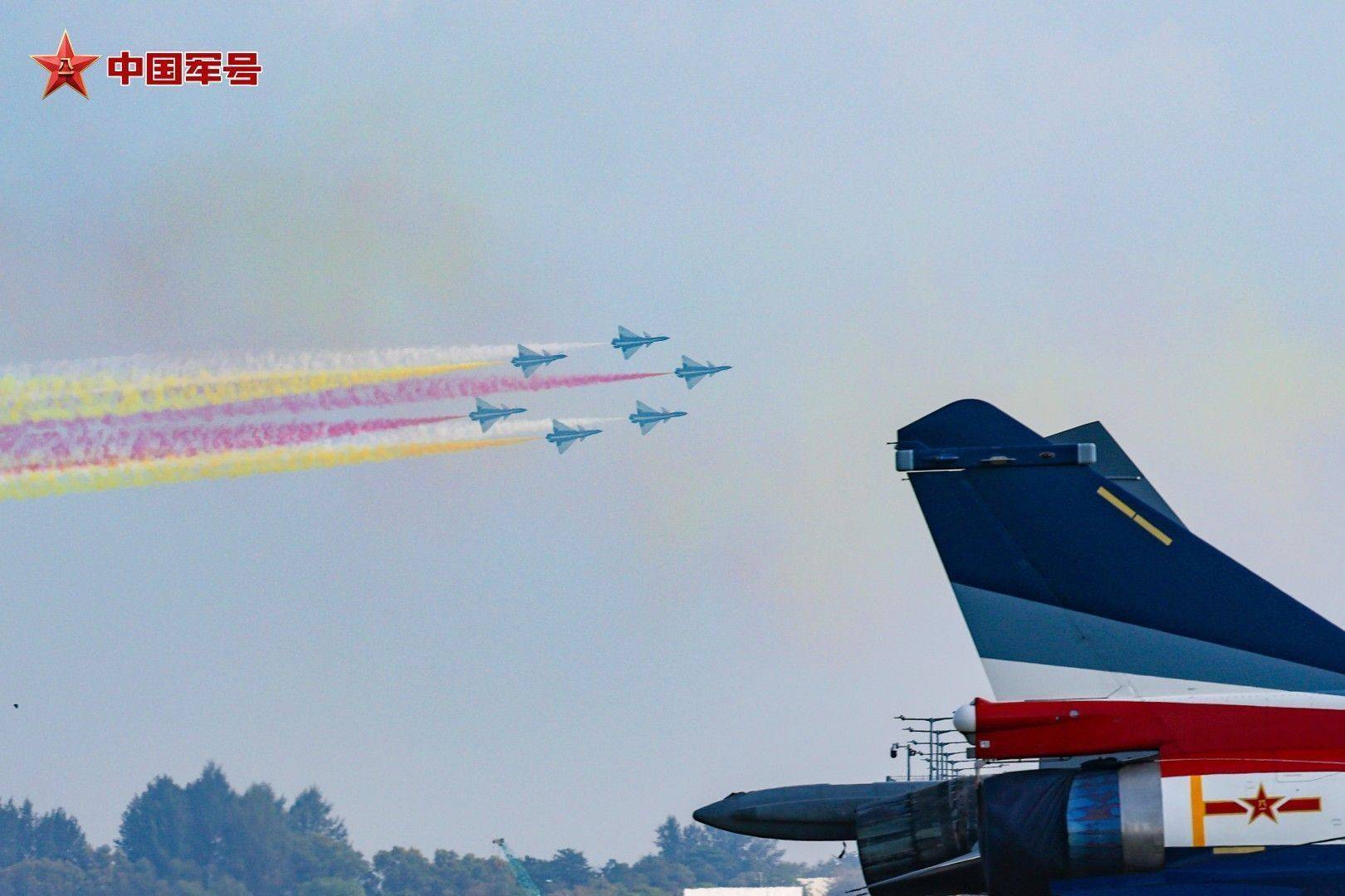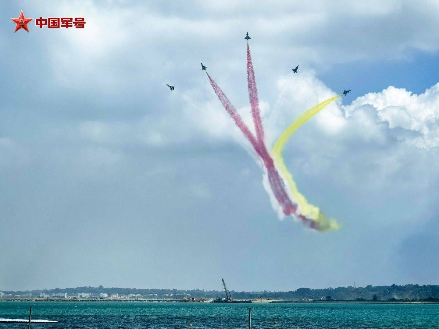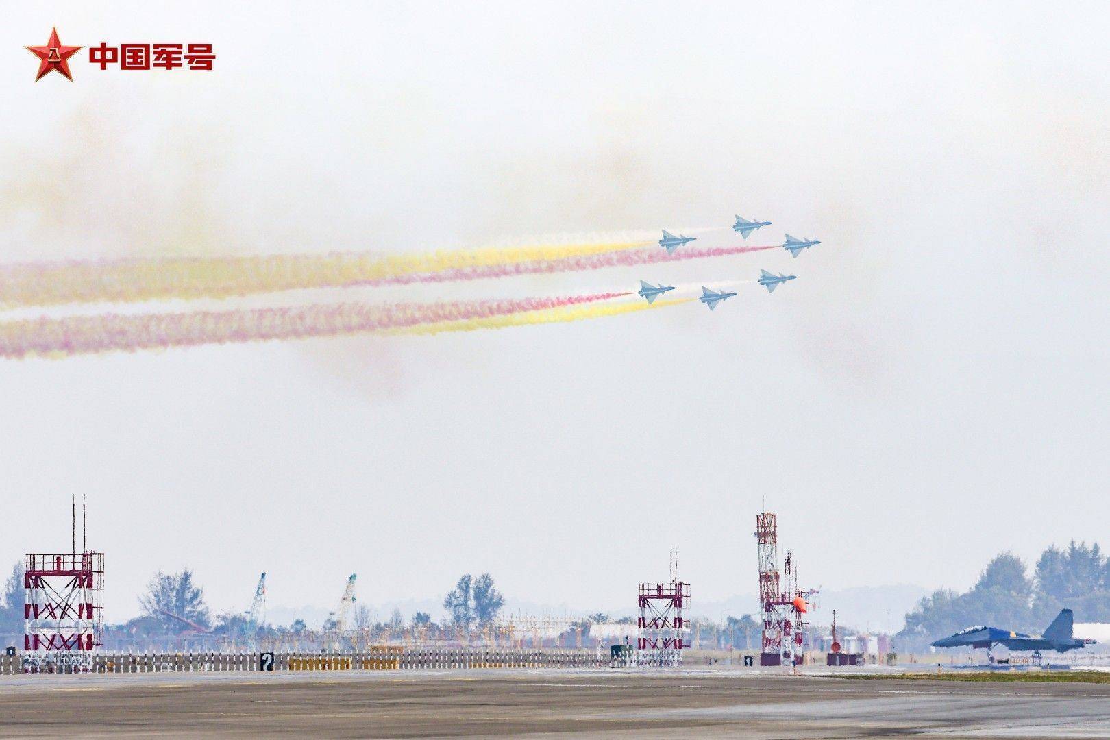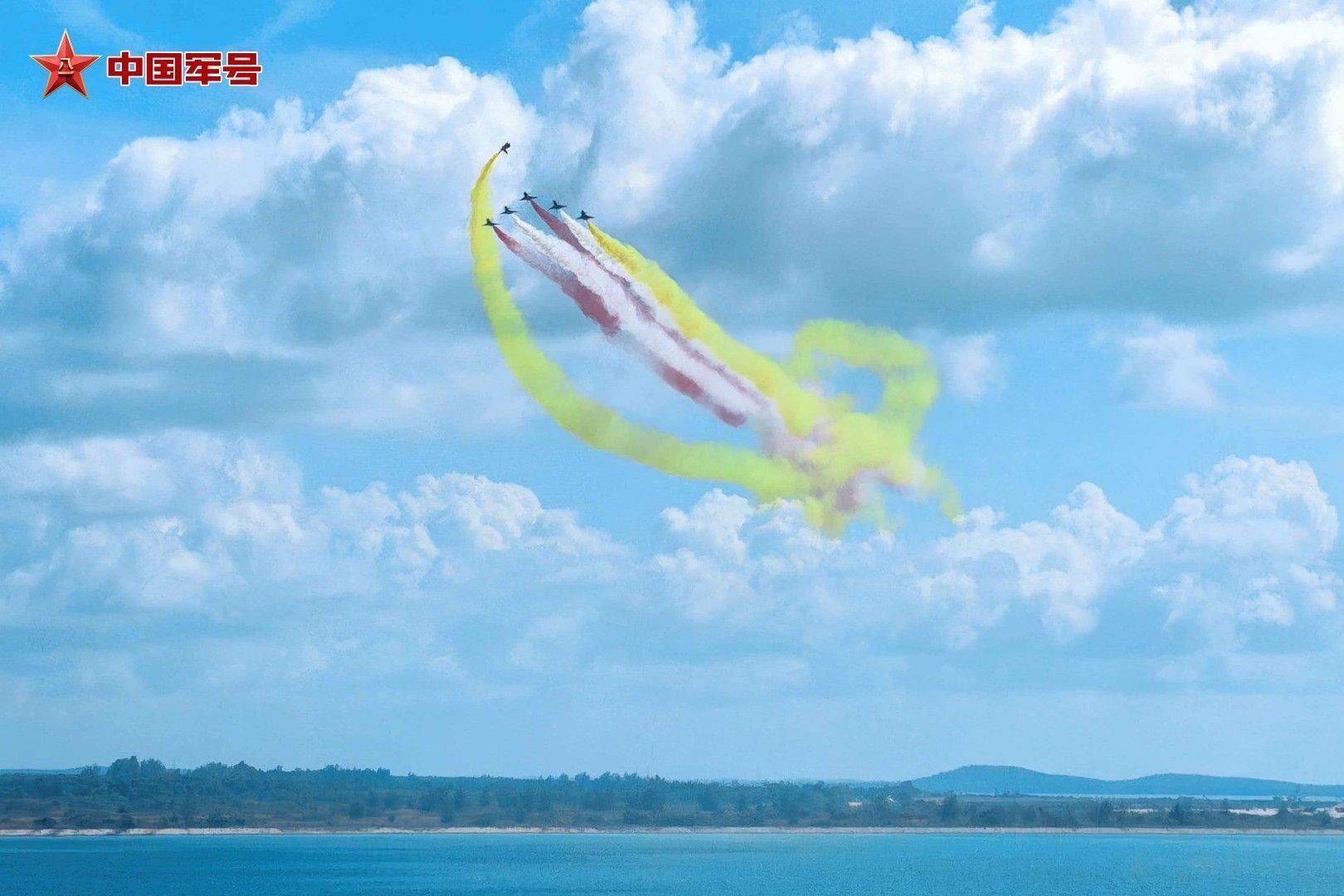 r碧海蓝天之间,战鹰诗意起舞。抵达饰演空域后,6架歼-10饰演机最初进行六机超密集编队通场,拉出标记中新两国国旗激情的红、黄、白三色调烟低空掠过海面,六说念彩色航迹犹如彩虹一般,勾画出优好意思多姿的轨迹。随后,五机、四机、双机、单机等特技看成有序连结,编队整王人齐整、看成开通考究。
