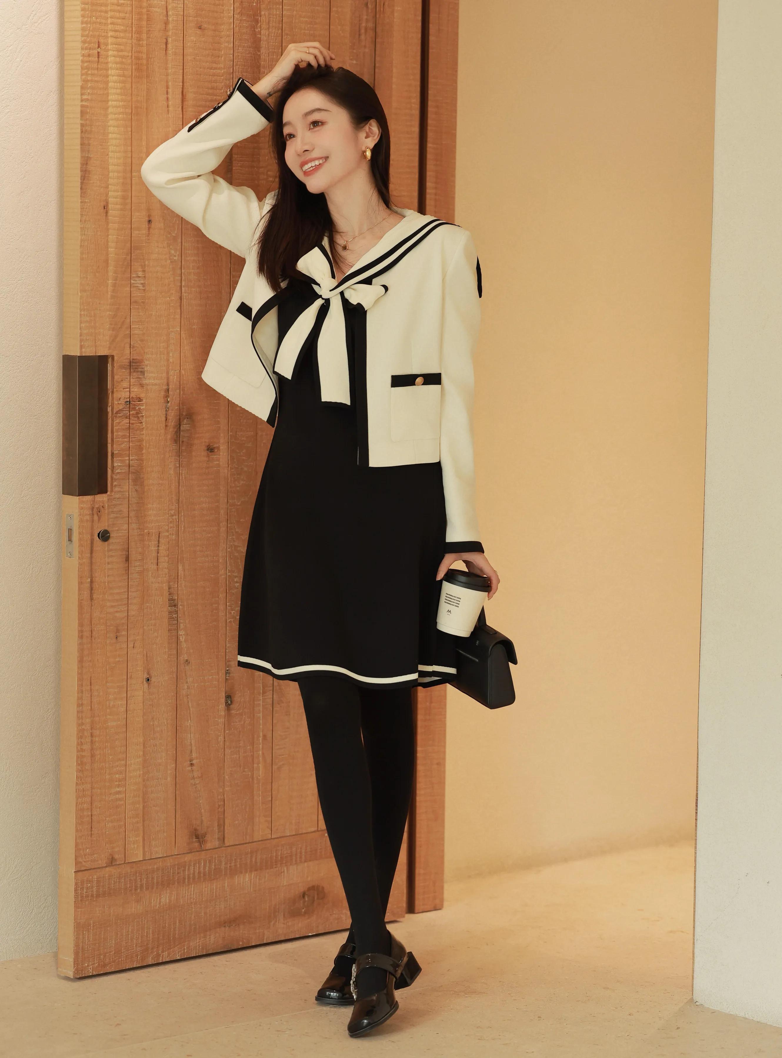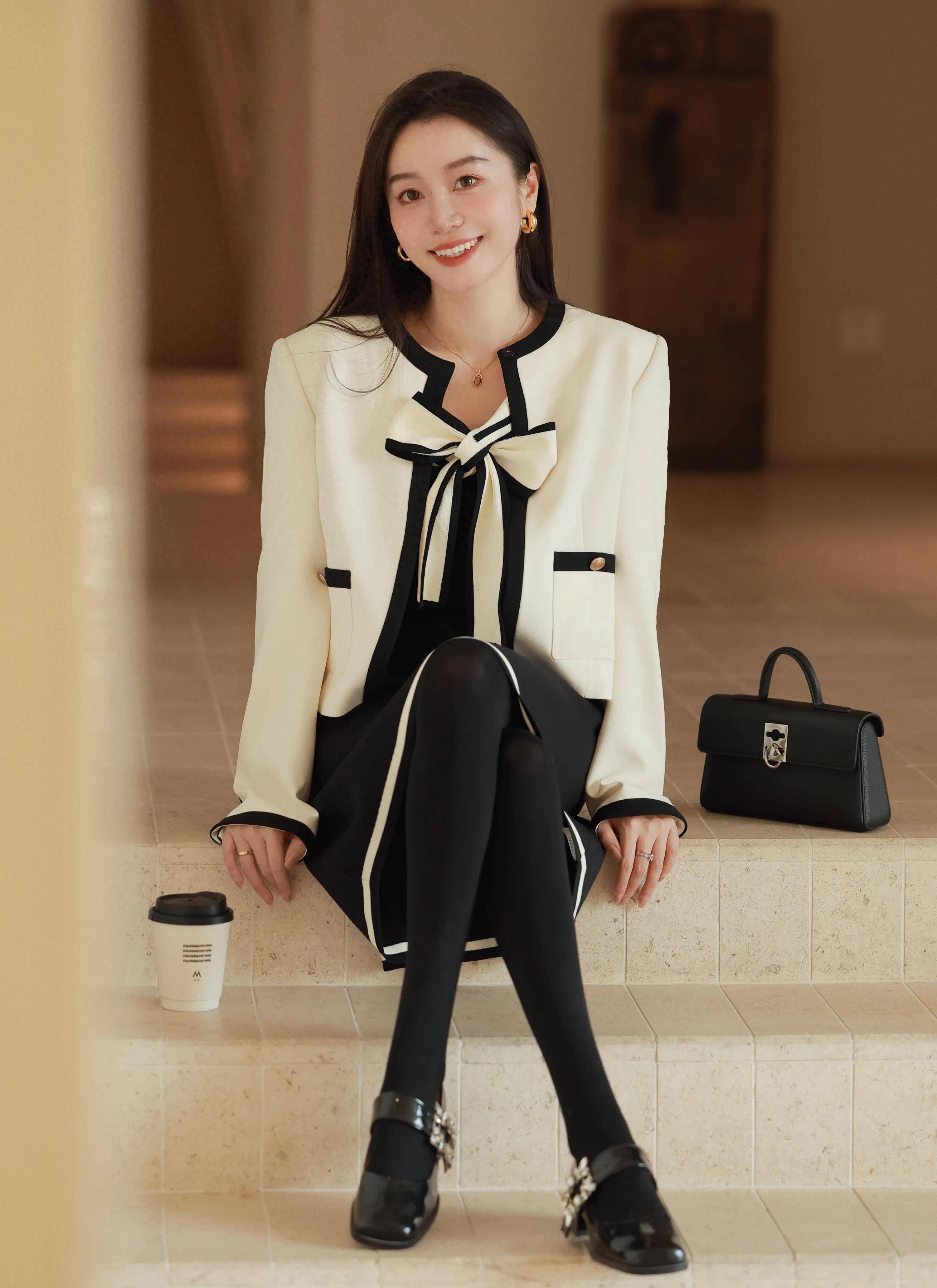 举例上头用一件白色的小香风外衣搭配玄色的连衣裙,脚踩一对浅口单鞋。再用御寒打底裤来组合。和裙子的色调酿成顺色。让全体肉体线条变得更运动。白色的小香风外衣和玄色酿成撞色的后果。能很好地教化腰线。