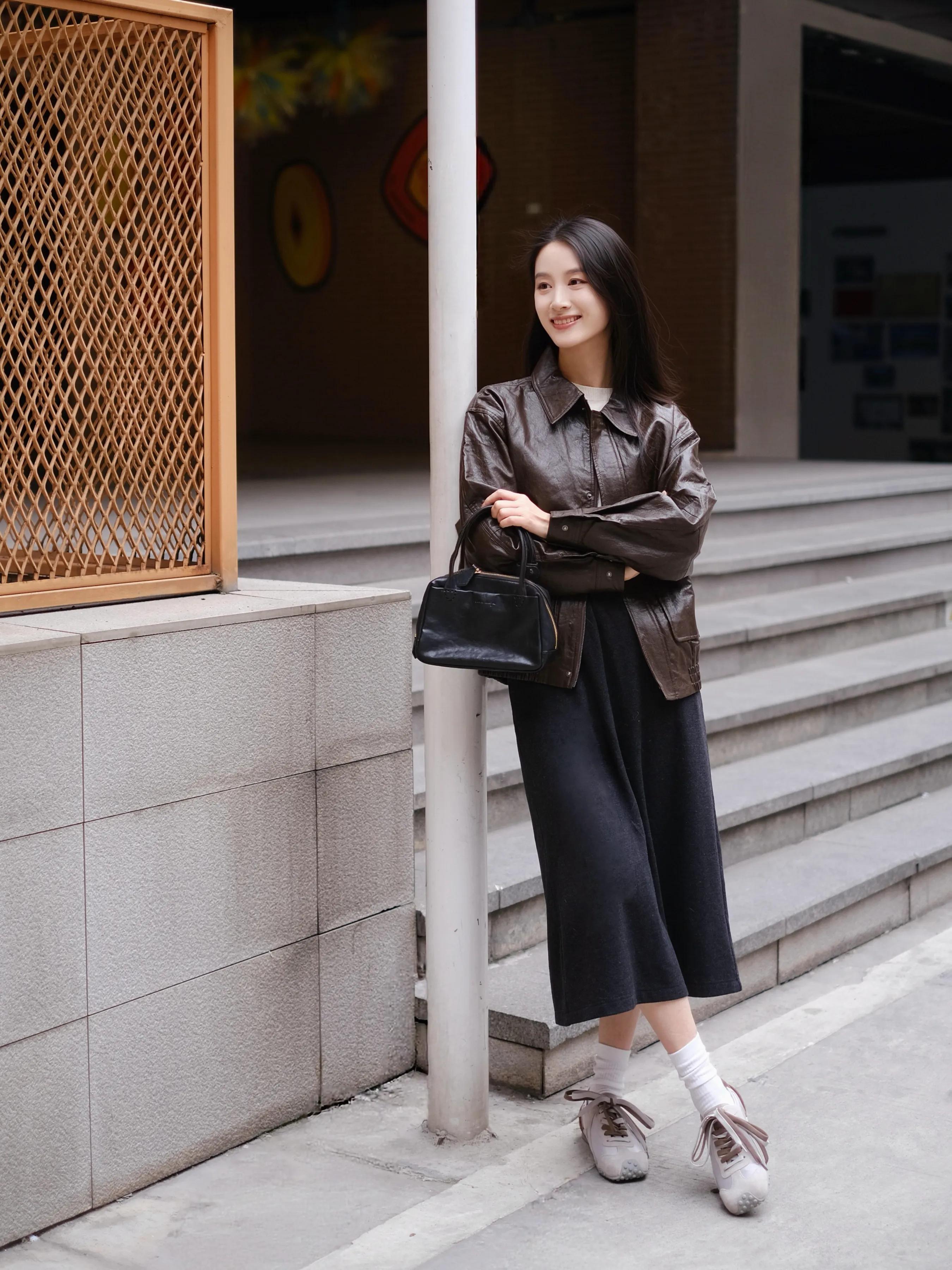 有的时候要多尝试不同的穿搭,因为衣裳面料的不同,技俩色系不同,穿在身上就有的不一样的视觉后果。举例用棕色的皮衣外衣内搭白 T 恤,加上一条直筒半身裙,脚踩一对德训鞋。就能使得穿搭者又酷又好意思。