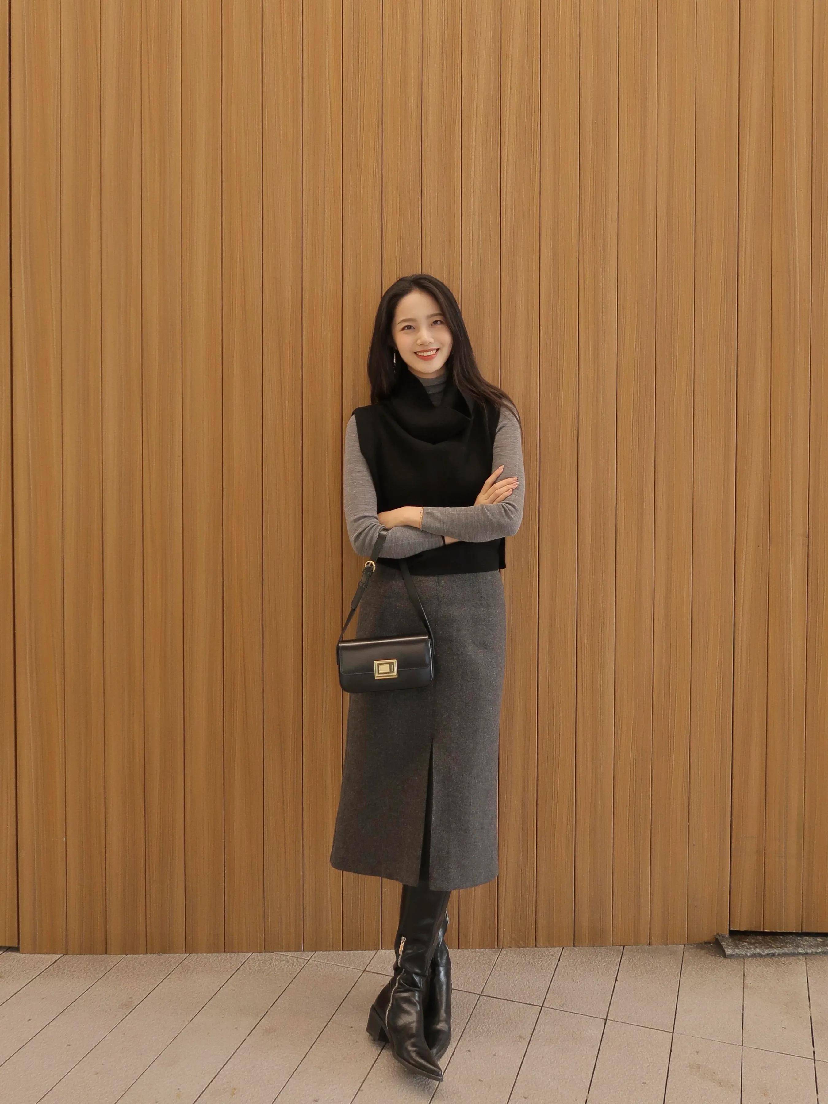 或是用减法的搭配阵势,用最基础的色调来组合,这么更容易镌汰出错率。举例用一件玄色的无袖竭诚背心,叠穿灰色毛衣,加上灰色的直筒开叉半身裙,脚上穿了一对中筒靴,酿成裙中靴穿搭。亦然当下相比流行的一种穿法。况且这种基础色穿搭低调不张扬。