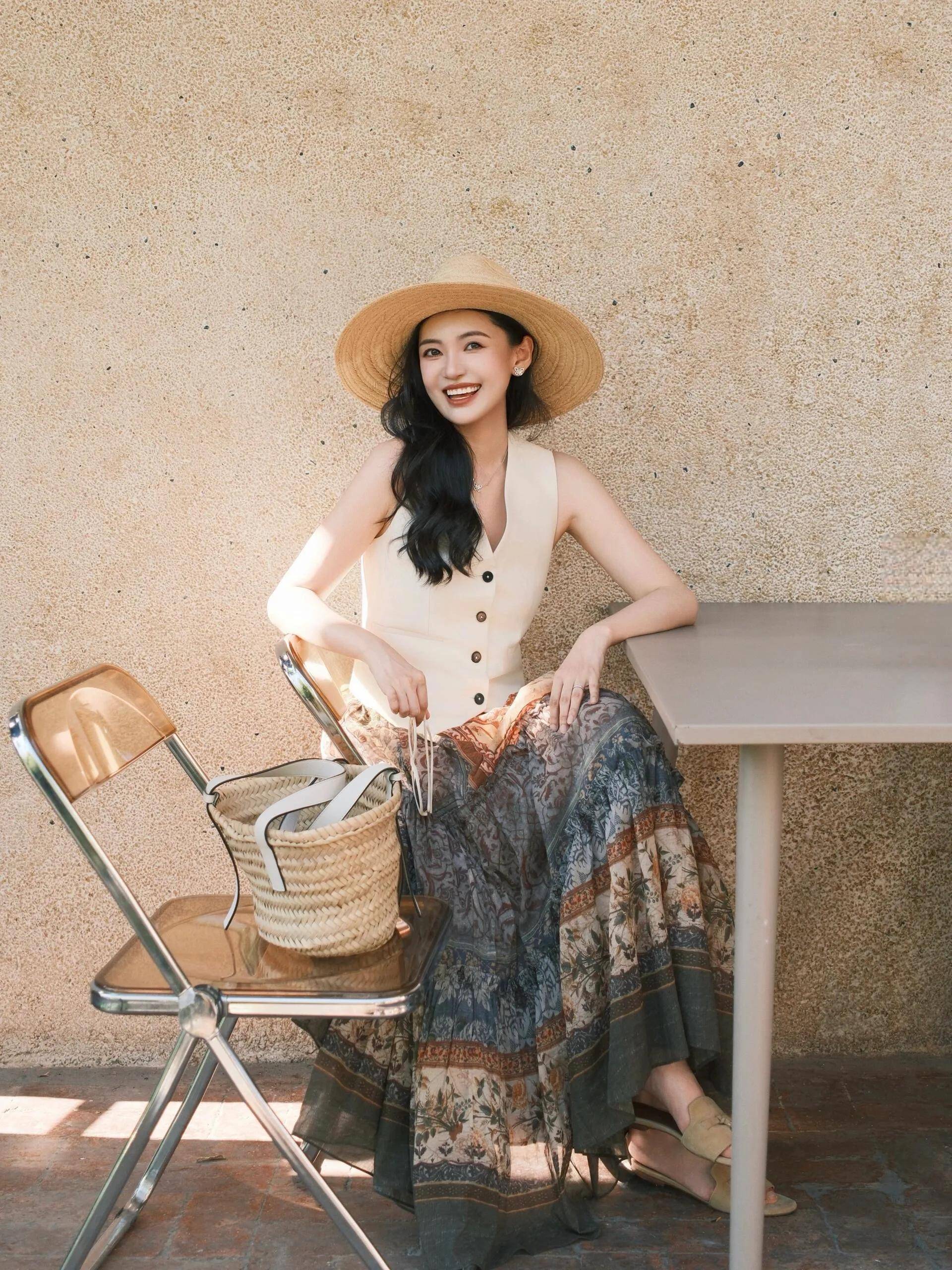 虽然了,我们也不错选拔相比个性的穿搭阵势,用一件白色的 V 领马甲搭配上印花的伞状半身裙,脚穿一对凉鞋,头戴一顶凉帽,这么的打扮相比适合外出旅游拍照的时候穿,很出片。