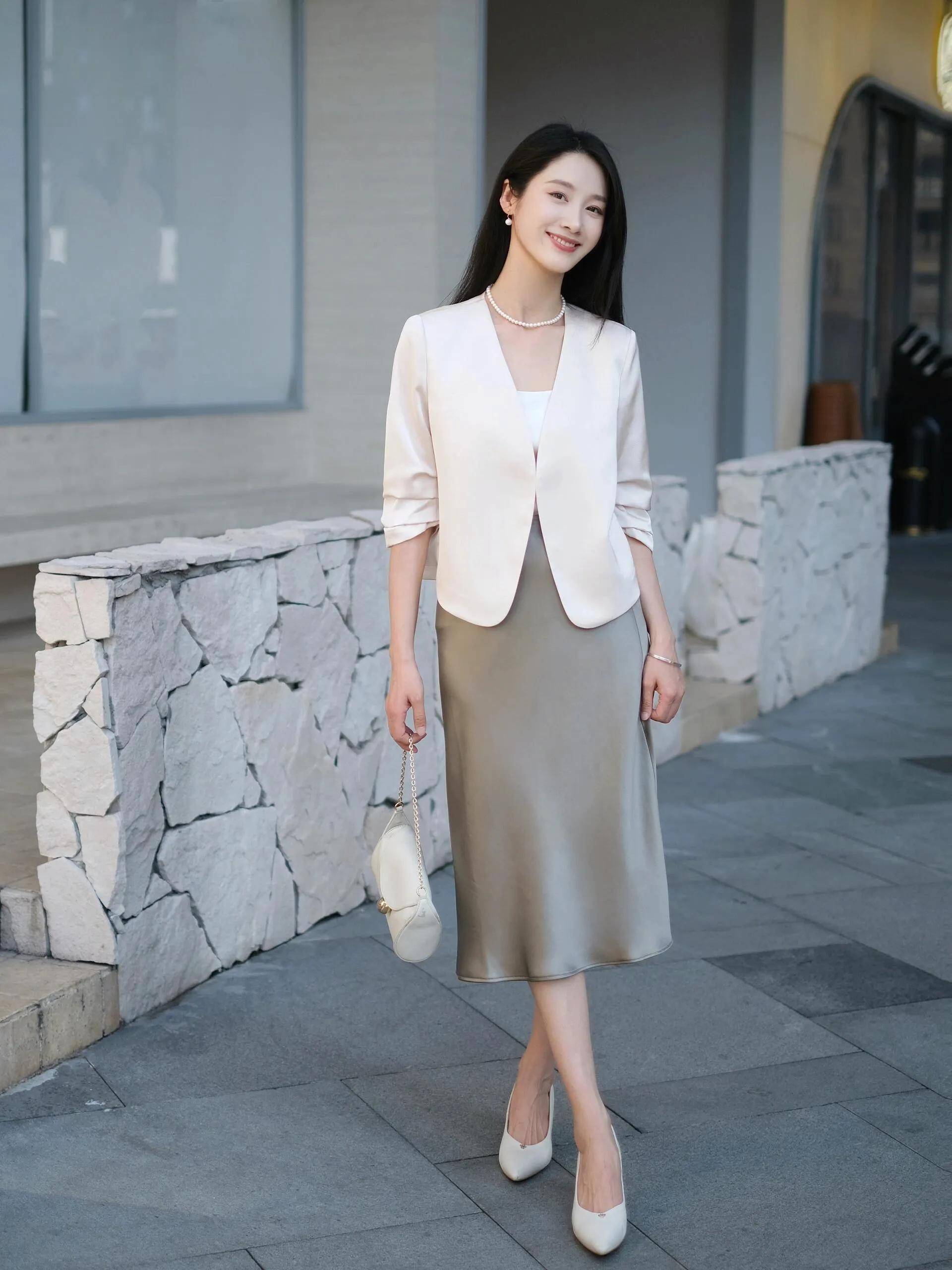 不同的场景选拔的穿搭当然有一定的差异。若是是职场女性,我们不错选拔无领的白色短款西服外衣,搭配上真丝面料的直筒半身裙,就要穿白色浅口单鞋,这么的打扮既干练又显赫气。再用白色的珍珠项链和珍珠耳饰来点缀,一会儿能使得穿搭者的造型更显赫气。