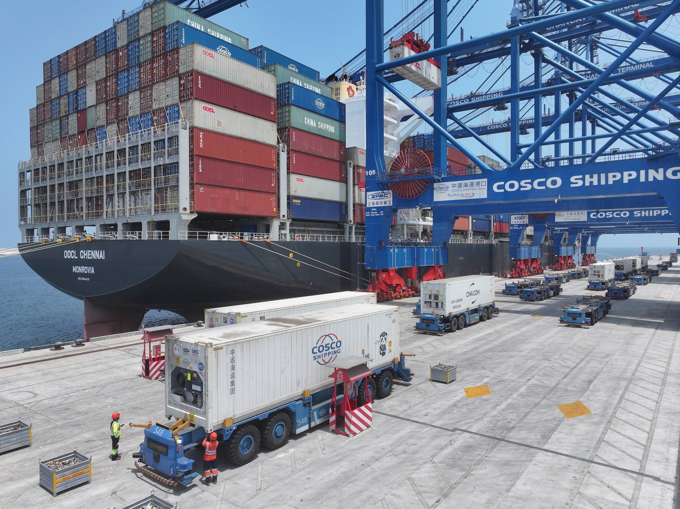 10月4日,在秘鲁钱凯港,智能集卡装载到港集装箱。(伊万·帕斯 摄)秘鲁学者路易斯·巴斯克斯指出,钱凯港开港后,当地高校已与铁路公司合作筹建铁路工程学院。“口岸带来的不仅是干事岗亭和资金流入,更燃烧了通盘社会的信心与发展能源,加速了国度工业化进度。”